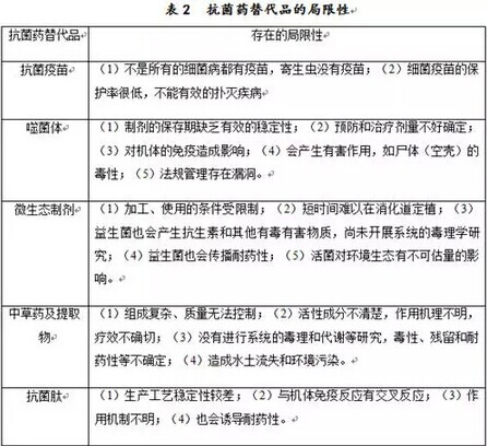 針對獸用抗菌藥在使用上出現(xiàn)的一些問題,目前出現(xiàn)了一些抗菌藥的替代品,如抗菌疫苗、噬菌體、微生態(tài)制劑、中草藥及其提取物、群體感應(yīng)及生物被膜抑制劑、抗菌肽、酶制劑,雖然這些替代品在使用過程中發(fā)揮了一定的作用,但是由于存在著不同的局限性而影響限制了使用,所以這些替代品是不能完全替代抗菌藥的,具體如表2所示。